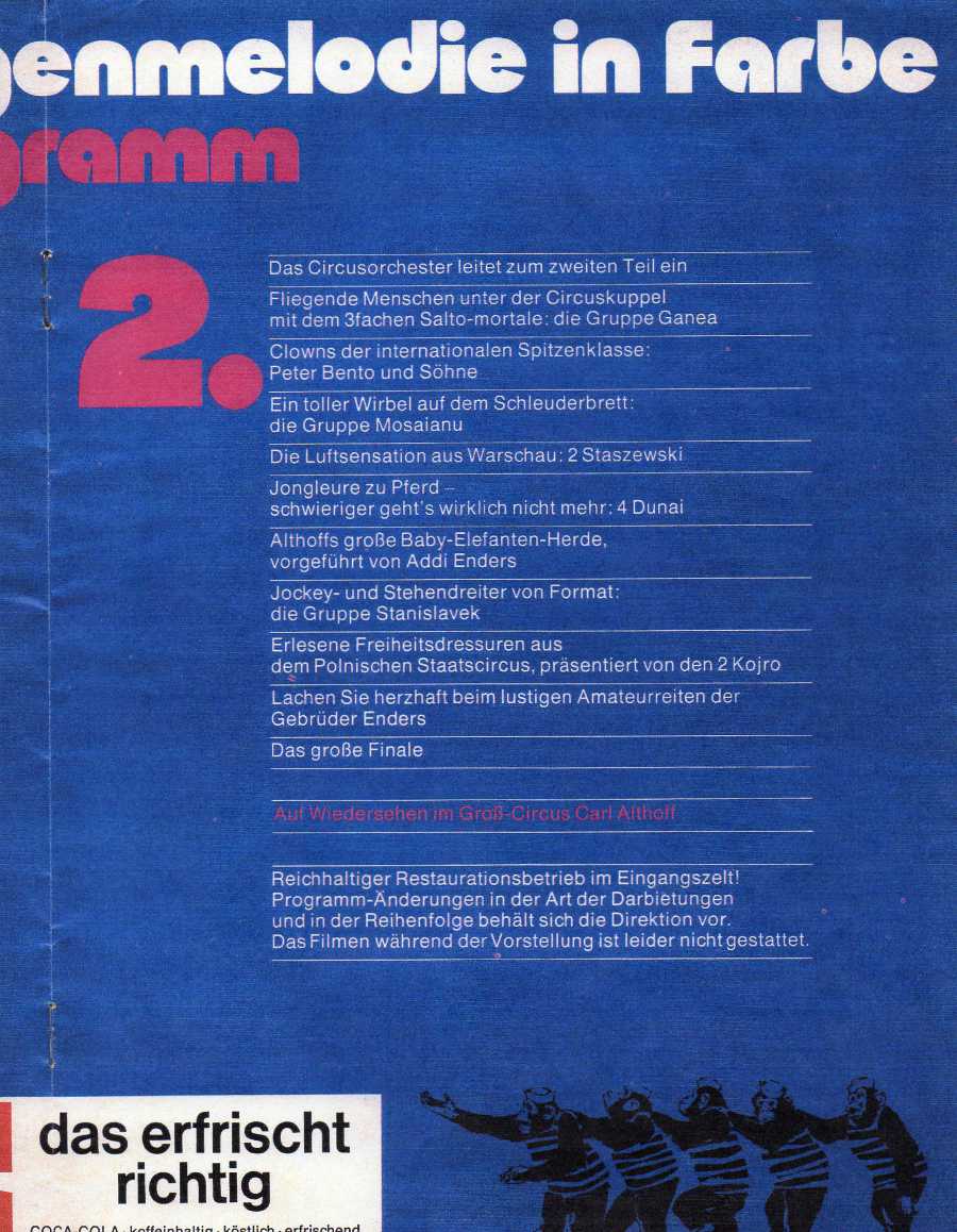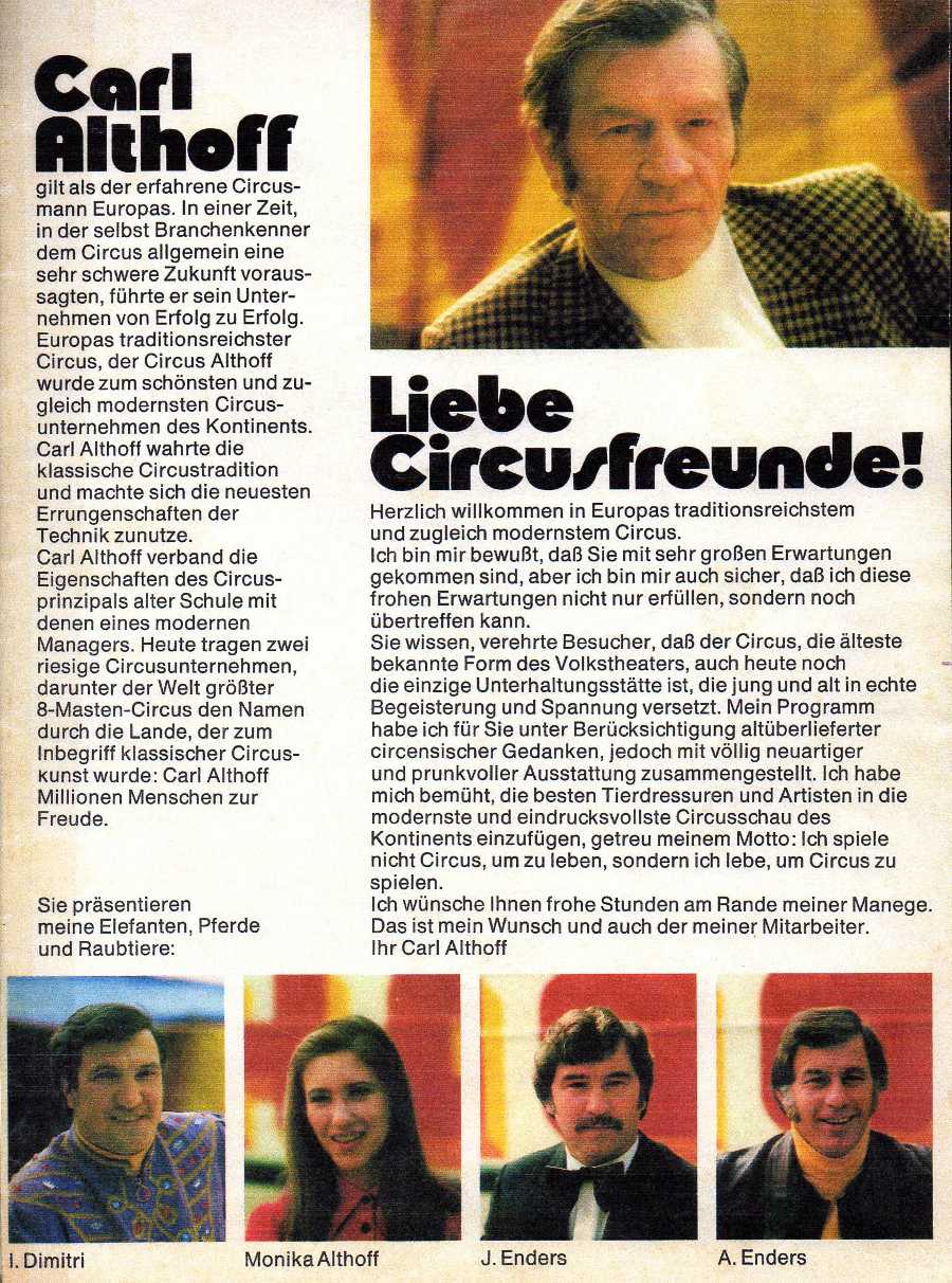 Właściciel Cyrku Herrn Carl Althoff w czasie II wojny światowej, uratował wiele osób, dając im schronienie i pracę !!! Cyrk wystęepował prawie do końca wojny, również dla wojska, więc gestapo aktorów nie prześladowało !!! w kilku miastach gdzie odbywały się występy cyrku przychodzili ludzie dziękujęc mu za uratowanie życia im lub ich rodzicom |